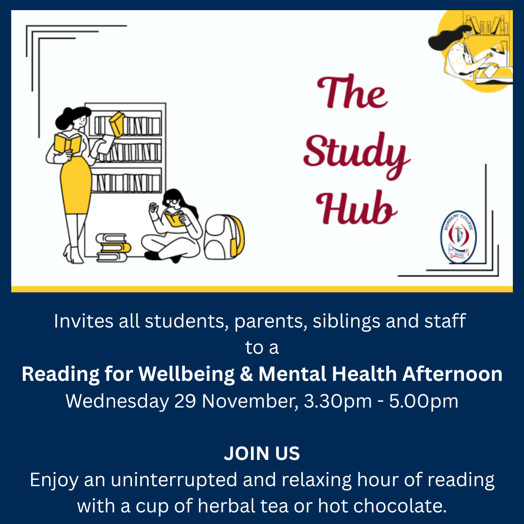 So, we are inviting all students, parents, siblings and staff to attend The Study Hub any time from 3.30-5pm, on Wednesday 19 November, and to enjoy an hour of reading with a relaxing herbal tea or hot chocolate, (supplied by The Study Hub), at our Reading for Wellbeing & Mental Health Afternoon!