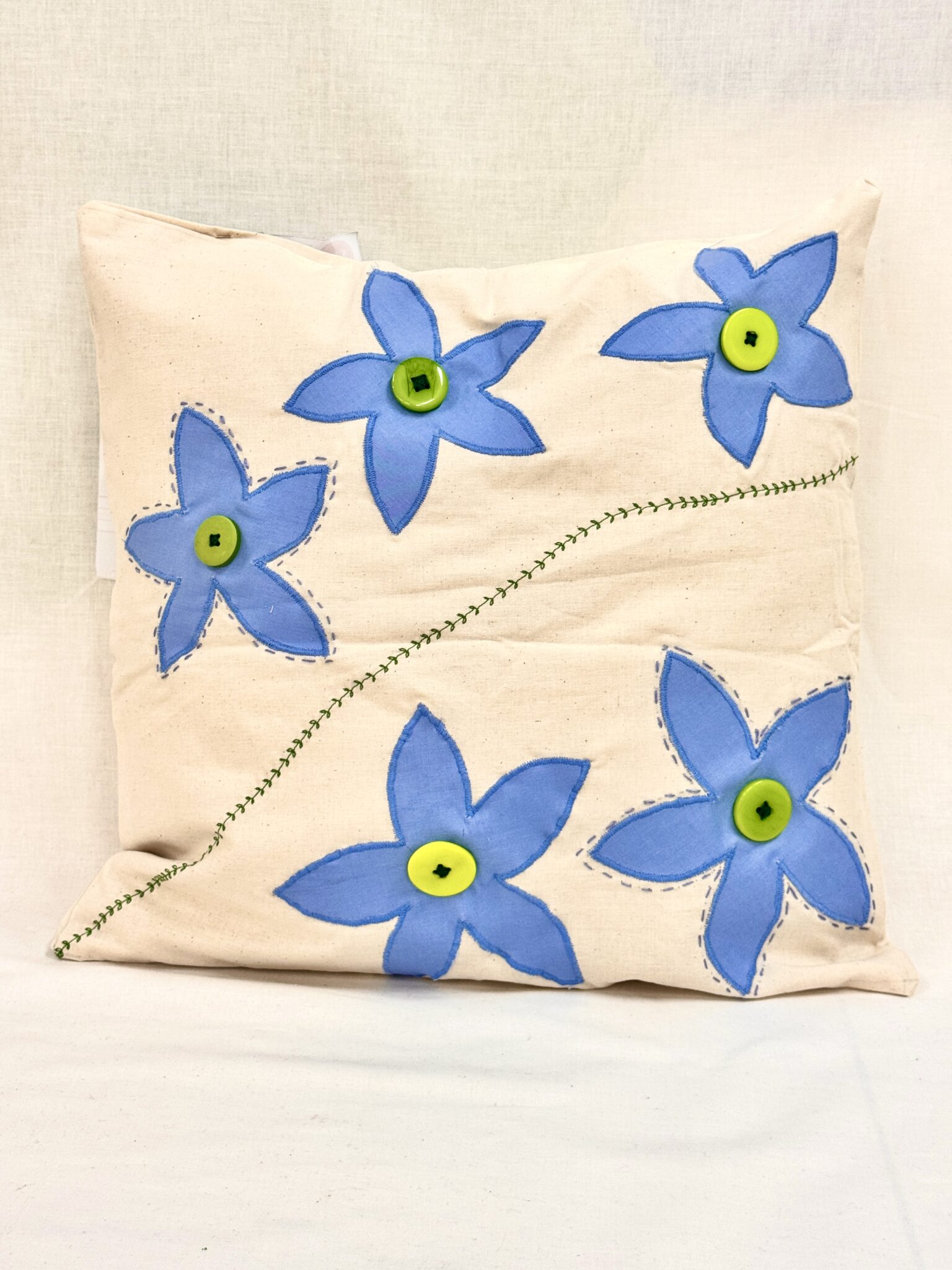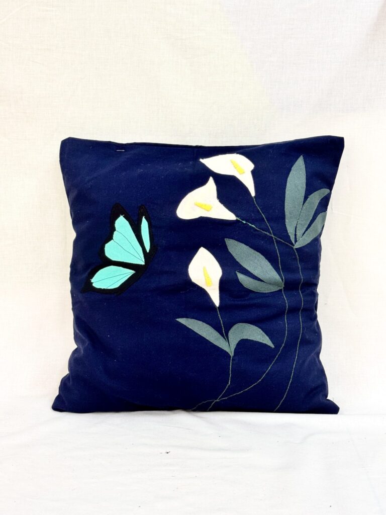Eva received Third Prize in Stage 4 for her beautifully constructed cushion titled The Blue Star Stitch. Drawing inspiration from botanicals, Eva incorporated five blue star creeper flowers against a soft beige background. The striking cobalt blue tones created visual contrast, while embroidered outlines and leaf stitching enhanced the botanical theme. The addition of button centres introduced a subtle three-dimensional element, elevating the overall craftsmanship. Eva’s design showcased careful attention to detail and a strong understanding of composition.