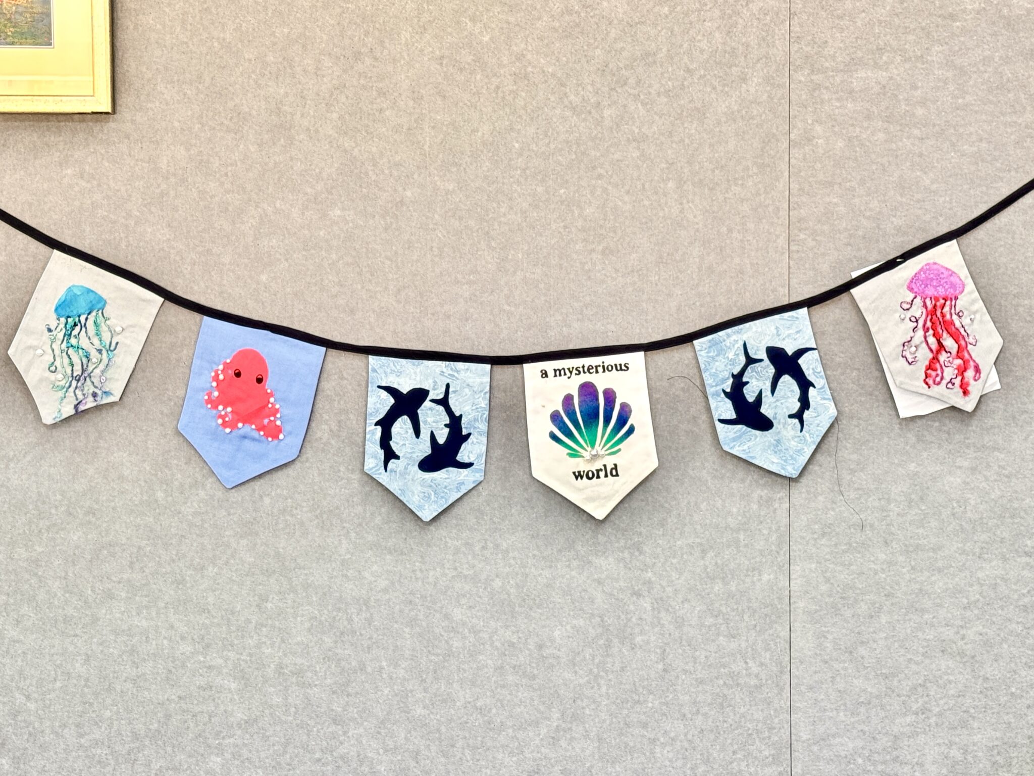 Isabella was awarded Highly Commended in Stage 5 for her dynamic bunting inspired by marine flora and fauna. Her work captured the hidden beauty beneath the ocean’s surface, combining applique sharks to create bold silhouetted forms with delicate embroidery to enhance texture and movement. Through stencil printing techniques, Isabella amplified natural spirals and patterns, creating rhythm and visual depth. The result was a striking and visually engaging textile piece that demonstrated technical confidence and creative maturity.