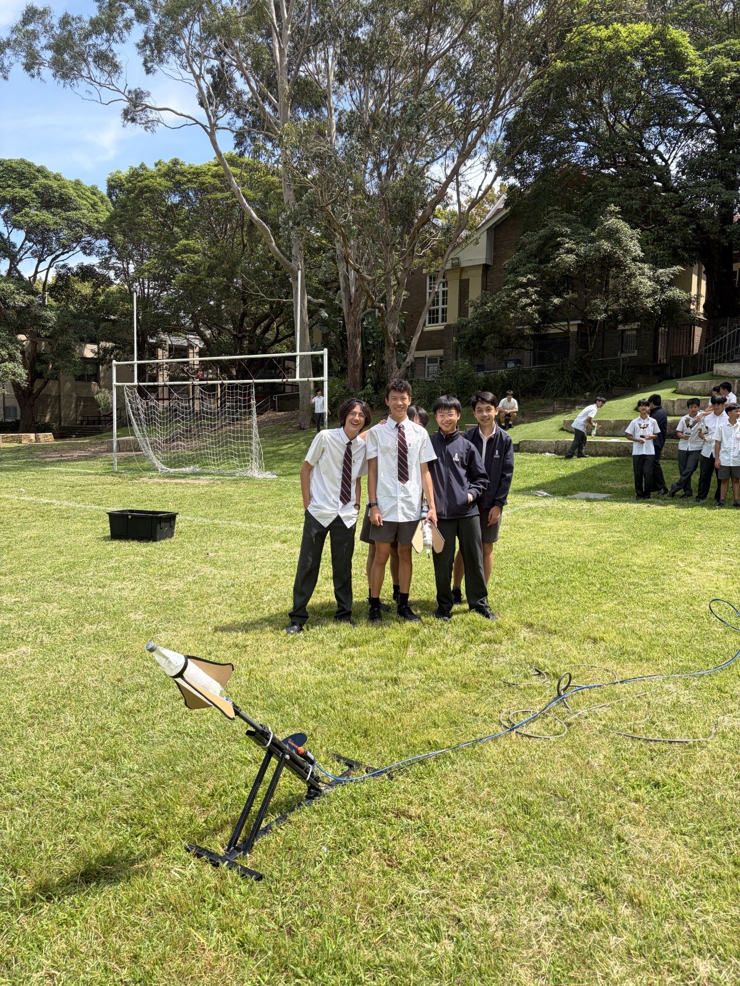 The Year 9 Engineering class recently had an exciting and educational experience by launching their very first water bottle rockets out on the school oval. This project began with careful design work, where students experimented with various dynamic shapes and specially crafted fin designs to optimise the performance of their rockets. The process allowed them to apply principles of engineering and physics in a hands-on way, fuelling their enthusiasm and curiosity.