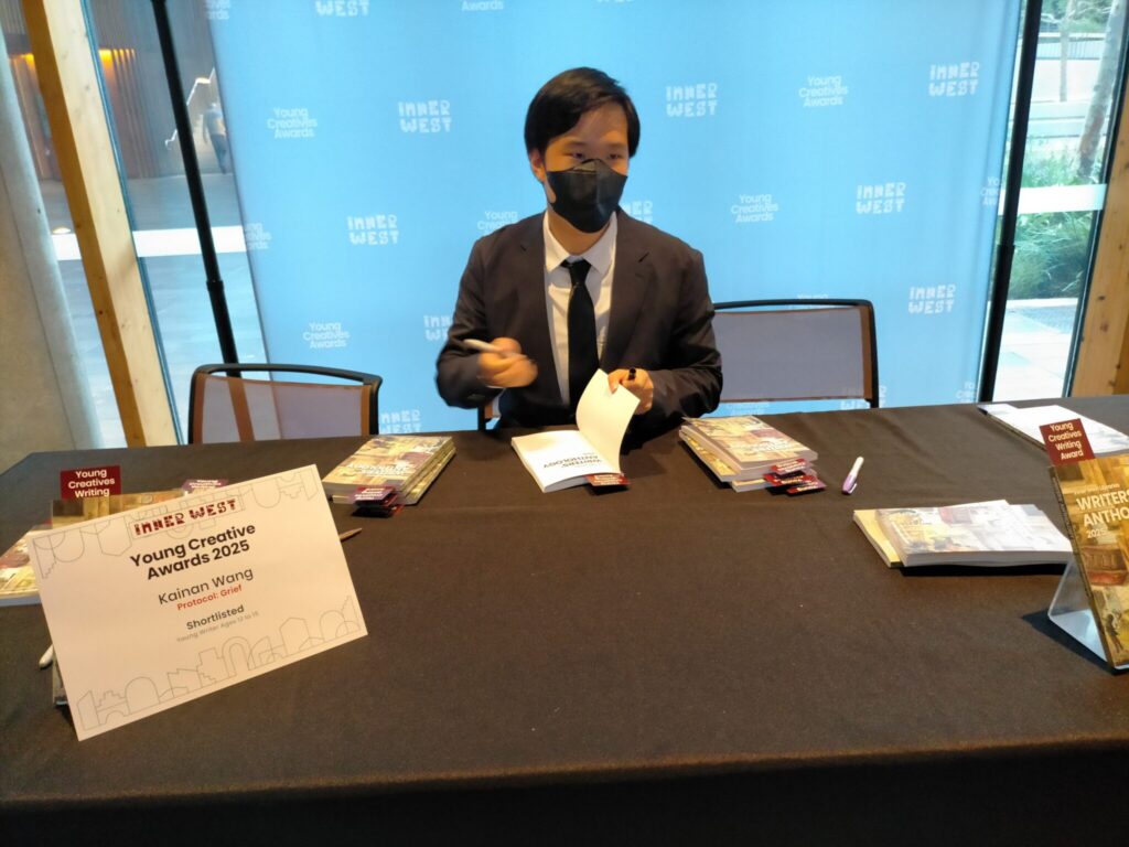 Kainan W from Year 10 was recently shortlisted in the Young Writers category, in the Young Creatives Awards 2025. Kainan Wang wrote a stunning work called Protocol: Grief in the 12-15 age category. Kainan and his family were invited to an Awards night at Marrickville Library on Friday 21st November where Kainan was presented with his certificate and was asked to sign multiple copies of the writers’ anthology which is the published collection of all the shortlisted and winning short stories in each age group. You will find a copy of the writers’ anthology in the library if you are interested in reading Kainan’s short story yourself.