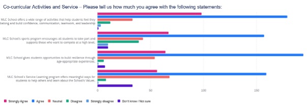 When we look more closely at some of the key Strategic pillars, most respondents agreed or strongly agreed with the statements provided, indicating strong levels of satisfaction. However, there are opportunities to improve on consistency of experience (in the classroom and in some sport and co-curricular activities), communication, personalised learning, and enrichment. With new leadership and specialised staff in the Learning Enrichment team and the introduction of our High Potential Learners Program this year, I have every confidence that perceptions of our achievement against these goals will improve. Many parents noted the fantastic changes within the Sports department, and we will continue to build our achievements in this space.