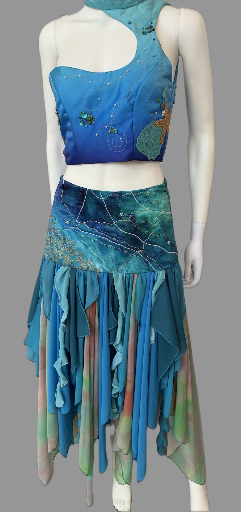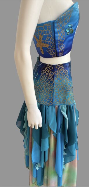 With inspirations depicted from the fairytale The Little Mermaid and designer Iris Van Herpen, the textile art skirt and top set aims to echo the timeless nature of storytelling and ethereal, intricate beauty of marine life, with using traditional aquatic hues and various decorative techniques. Techniques that have been included to reflect the inspiration are dye sublimation printing on both the skirt yoke and top, gold glitter Cricut cut Heat Transfer Vinyl also adorning the skirt yoke and the top, gold, pearl and blue cording on skirt yoke, gold double thread stitching on the top, machine embroidered starfish and shells and beading and buttons. The skirt is made from several layers of handkerchief hem georgette squares and curls that have a roll hem finish.