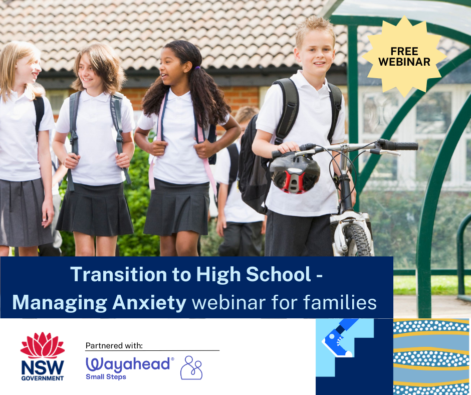 The Northern Sydney Local Health District’s School Years team have partnered with Way Ahead to offer a freeTransition to High School – Managing Anxiety webinar for parents and carers of