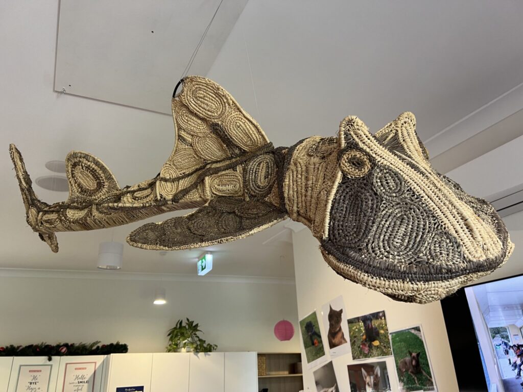 As the weeks went on, our confidence grew. Each session pushed us to be more careful with our hands, more focused on the details, and more willing to try new patterns. Some of us experimented with colours, shapes and tighter stitches, and it was so cool to see how different everyone’s arts were when using the different colours. One of the best parts was the teamwork. We helped each other when the coils came lose or the thread tangled, and we just had fun. By the end of the workshops, we had not only created beautiful woven items, but we also gained new skills and created the beautiful port Jackson shark sculpture. It was such a fun experience, and we’re really grateful we got to learn a new skill and make something meaningful. Our amazing Port Jackson shark is now hanging in the Middle School office, so please pop by and have a look. We are so proud of the final product.