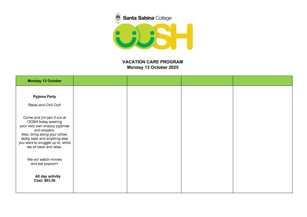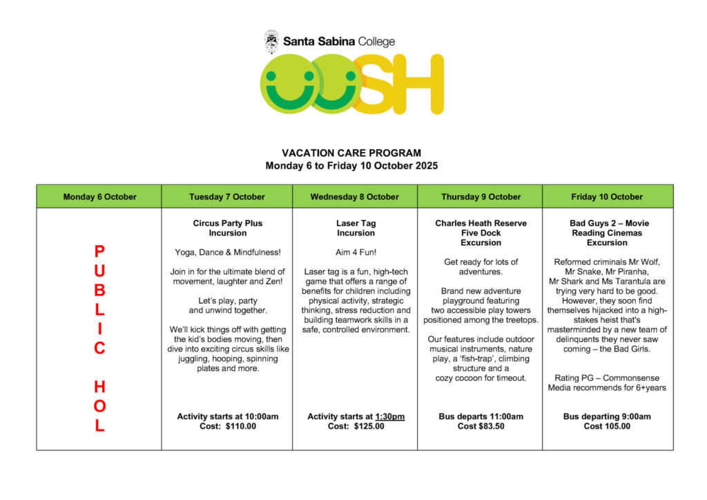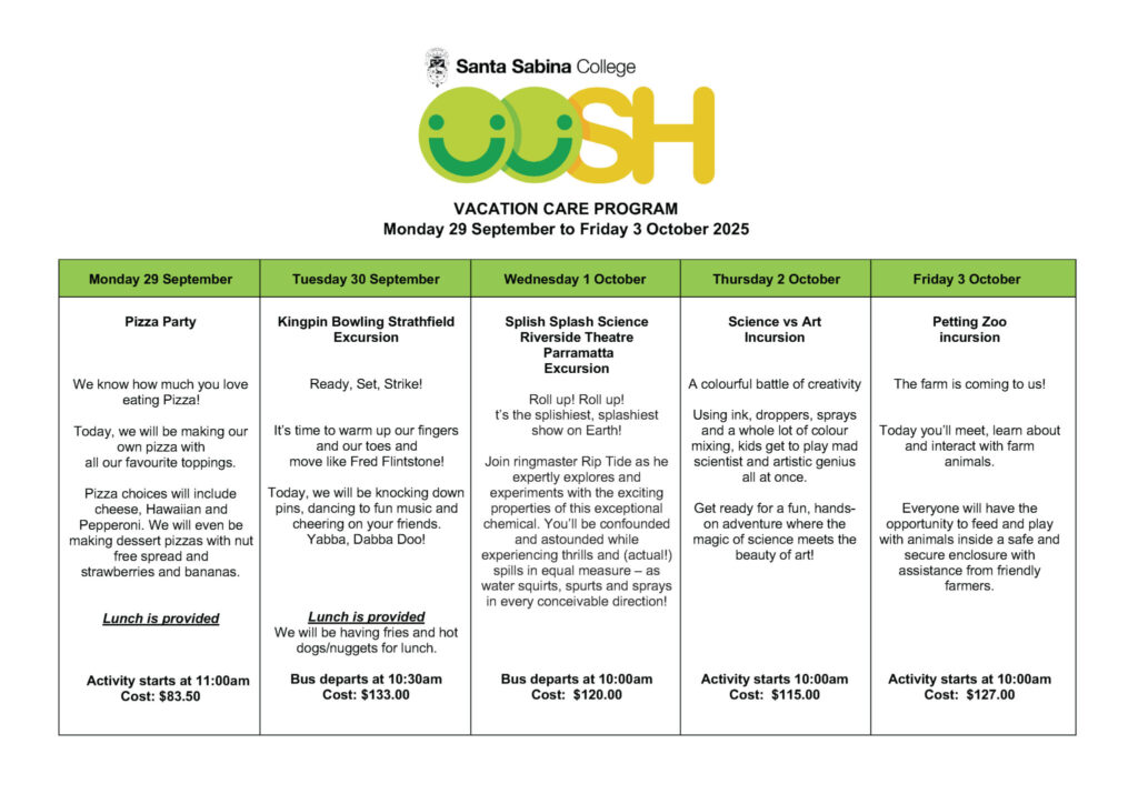 Students from Del Monte and Gioia House are all welcome to attend Vacation Care once they are enrolled in OOSH. To learn more about enrolment in OOSH and vacation care, please email our OOSH Coordinator Frances Windon at ooshmail@ssc.nsw.edu.au