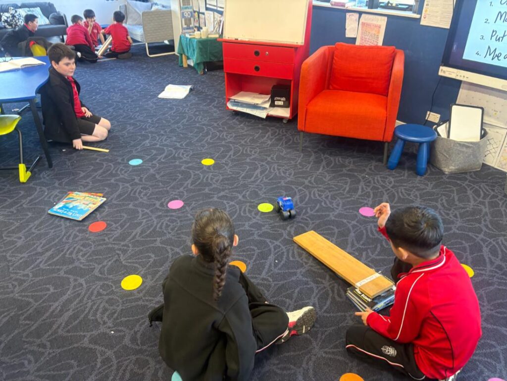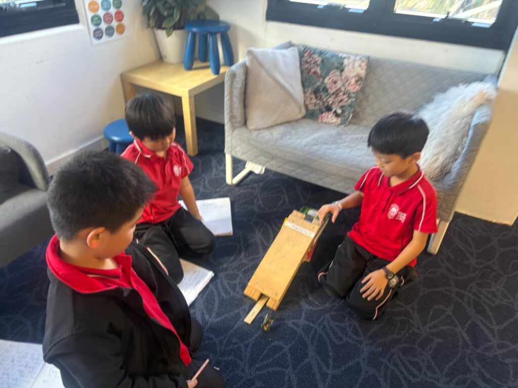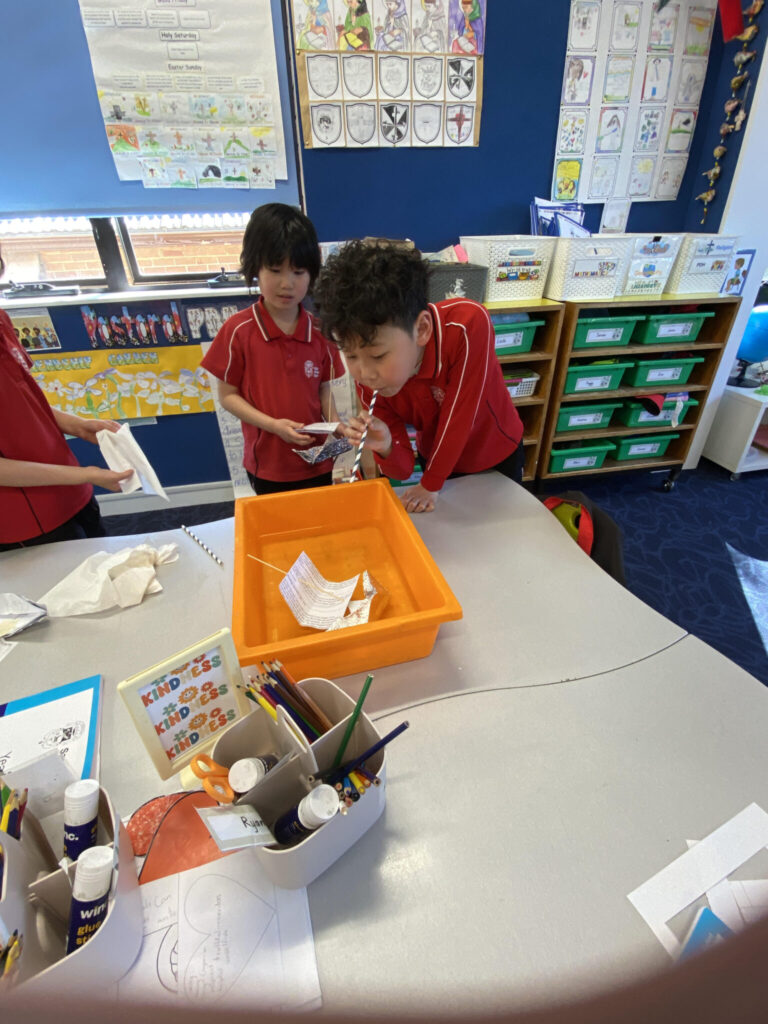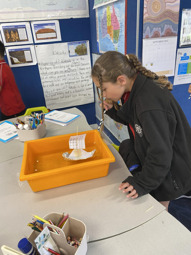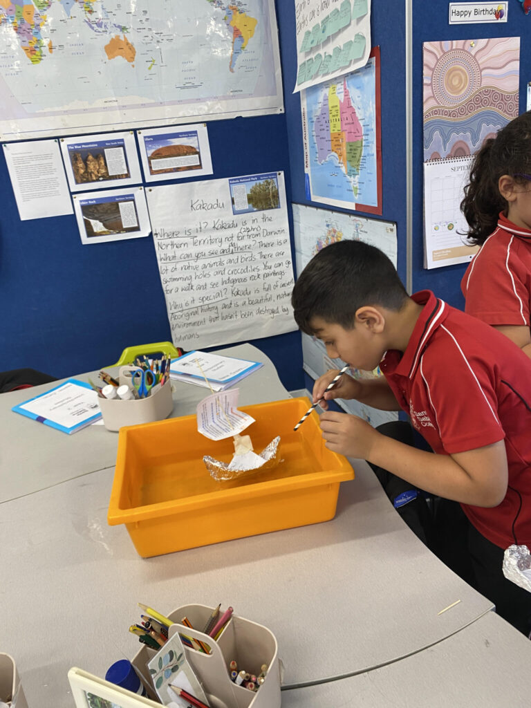 The students conducted a number of experiments to support their learning. They launched balloon rockets and cars to learn about push and thrust force. They designed and floated boats to observe how forces move on water and they explored gravity in different ways.