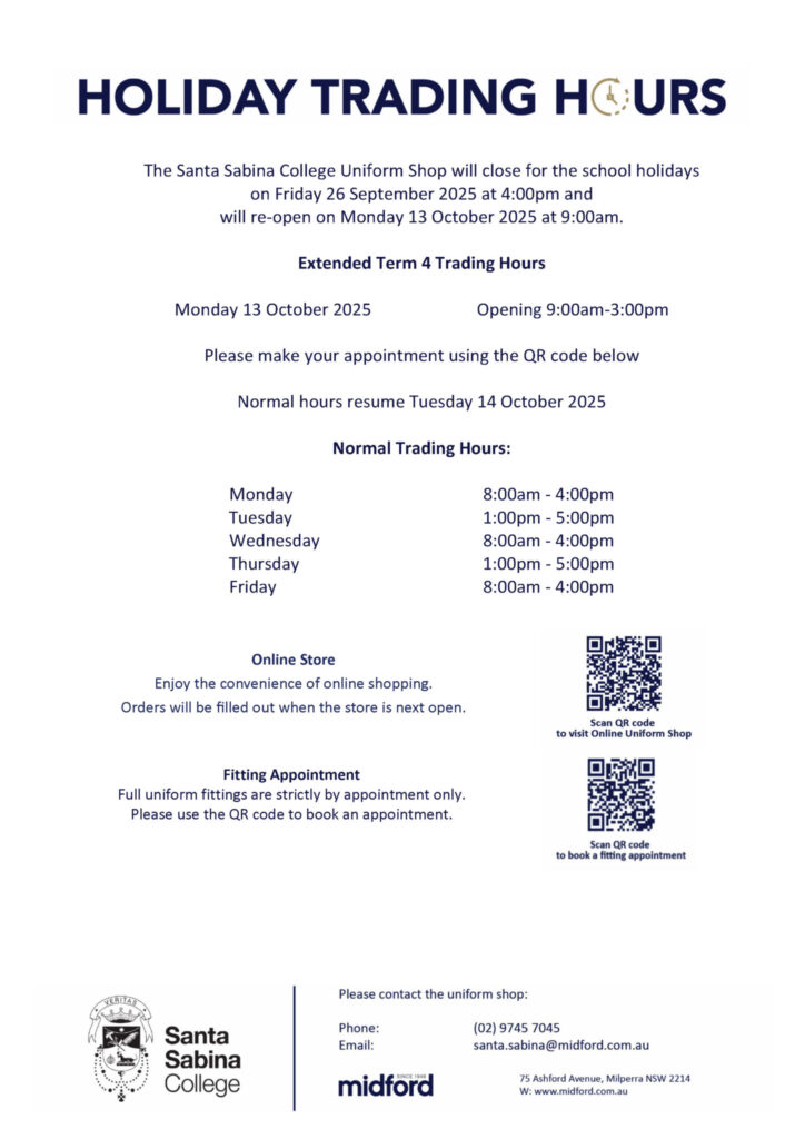 As our Year 12 students prepare for their final exams, we continue to offer a range of academic support to help them succeed. Holiday workshops will run across key subjects, providing targeted revision and exam preparation. All HSC students should attend the Studies of Religion Day on Thursday 9 October. Students also have access to ATOMI, our online learning platform, which offers engaging video lessons, quizzes and study tools tailored to the HSC curriculum. Additionally, students can take advantage of the Western Sydney University Free HSC Study Sessions, running from 29 September to 3 October. These online sessions cover 15 major HSC subjects and include expert-led content reviews, exam strategies and practice deconstructions. To learn more or register, visit: