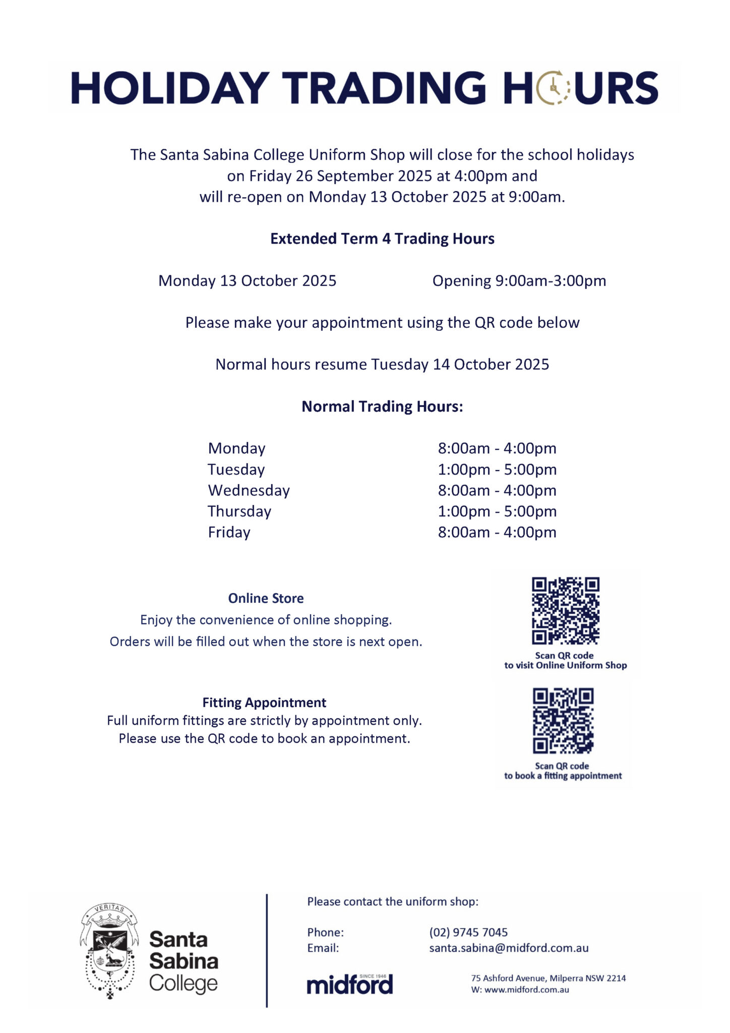 Term 4 commences on Tuesday 14 October. Students are required to return in full summer uniform. Please refer to the uniform guidelines in your child’s school diary to ensure they are dressed appropriately from the first day of term.